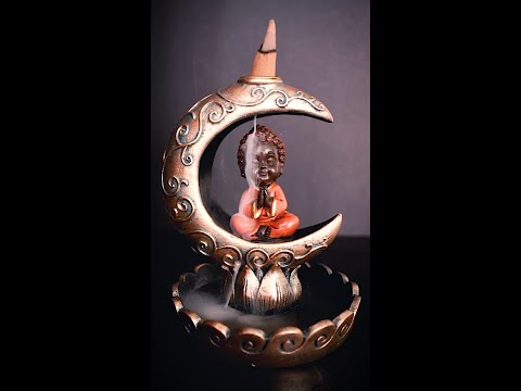 - Backflow incense burner shaped like baby Buddha meditating in a crescent moon.