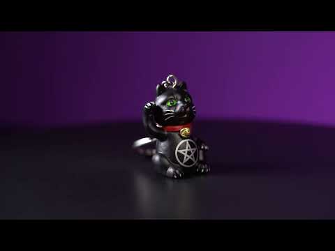 Mystical keychain shaped like a lucky black cat. Features vibrant green eyes, a golden bell and pentacle design on a traditional keychain ring