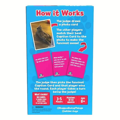 • Comes with hilarious double-sided photo cards and the funniest caption card.