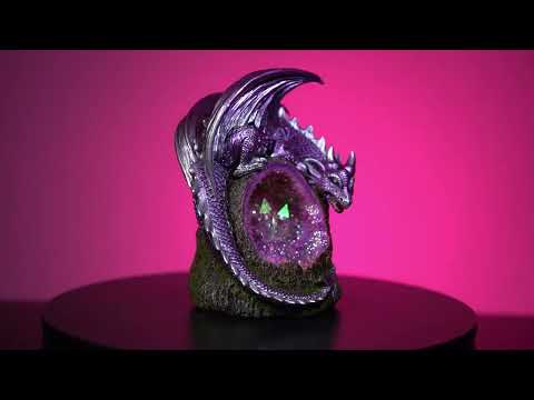 Magical backflow incense burner featuring a metallic purple dragon curled around a tree stump. Twinkling geode surrounds three prominent crystals. Detailed sculpting and colour. changing LEDs make this burner a beautiful functional ornament.