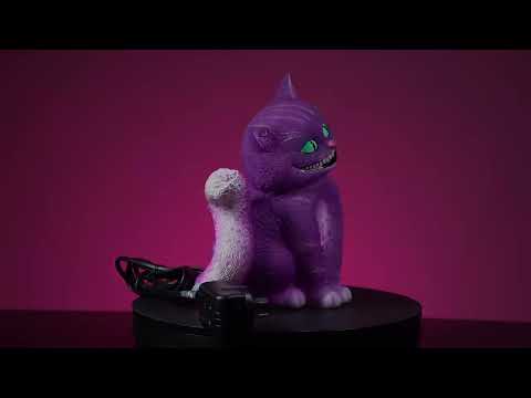 - LED table lamp of a grinning mad cat with vibrant turquoise eyes