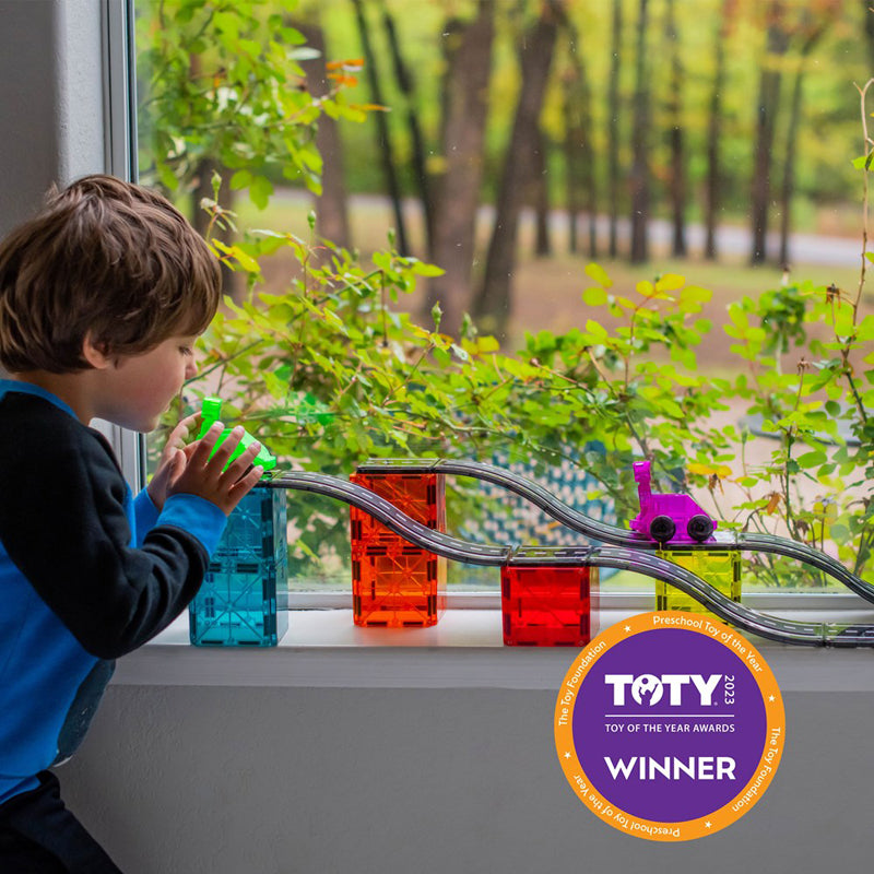 WINNER - PRESCHOOL TOY OF THE YEAR AWARD 2024 at NEW YORK TOY FAIR!MAGNA-TILES Downhill Duo 40-Piece Magnetic Construction SetThe ORIGINAL Magnetic Building BrandCar-loving kiddos, we have something for you! Introducing MAGNA-TILES Downhill Duo 40-Piece set, the first fully magnetic racing adventure that is designed for little hands and big imaginations. If you are looking for a new way to inspire their creativity, build their motor skills and support their STEAM learning, buckle up and imagine the possibilities with new ramps, roads, dashers and figures!Included in the set: 40 magnetic pieces including 4 Ramps, 2 Vehicles (Green and Purple), 2 Figures (Green and Purple), 6 Road Squares, 2 Finish Line Rectangles, 24 Squares.What Makes It Unique: Includes Ramps, Dasher vehicles, Figures, Finish Line Rectangles and popular Road pieces, providing an easy, child-led way to introduce exciting action and STEAM learning to play time. Developmental: Encourages children to learn through play, exploring cause and effect and other logic principles, while fostering the development of hand-eye coordination and fine motor skills.Great for Gifting: Makes a great gift for car-loving kids ages 3+.More to Explore: Check other sets in the new MAGNA-TILES In Motion collection, including the Dashers 6-Piece and XTRAS: Roads 12-piece sets.Always Compatible: All pieces are compatible with and complementary to all other MAGNA-TILES sets, including fan-favorites like Builder 32-Piece set and Metropolis 110-Piece set.Safety Guaranteed: All MAGNA-TILES pieces are built to withstand countless hours of playtime. Our signature lattice prevents cracking, while fastening rivets keep magnets safe and secure.Superior Quality: MAGNA-TILES pieces are made from food-grade, non-toxic MABS plastic that's free from BPAs, phthalates and latex. Our magnets are selected with kids in mind, letting them easily pull apart tiles for safe, frustration-free building.Made With Purpose: MAGNA-TILES sets are loved by builders aged 3-99 and designed for kids to enjoy, without instructions or adult assistance.Meaningful Play that is: Fun, Engaging, Experience Based, Child Led and Developmental.For Ages 3yrs+Pack Dimensions (cm): H: 30 W: 43 L: 6.6