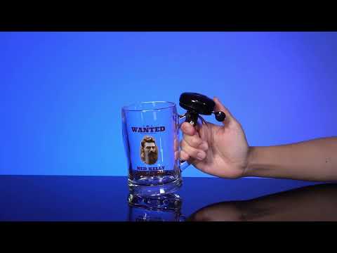 Glass beer mug with a black bell attached to the handle - ring it when it's time for another drink! Features Aussie icon Ned Kelly's wanted poster. Perfect for keeping your glass full at all times!